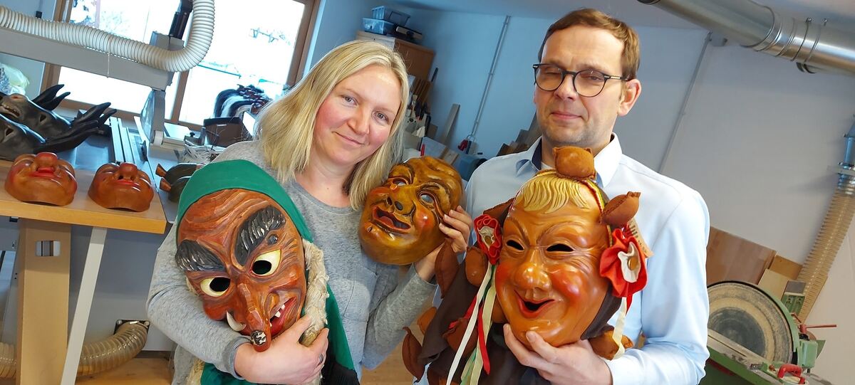 Maria und Markus Heinzelmann sind nicht nur selbst in der Fasnet aktiv. In ihrer Werkstatt in Steinhilben entstehen die Holzmasken, die Narrenzunftmitglieder in der fünften Jahreszeit tragen. Mit Schnitzmesser und Farbe hauchen die Heinzelmanns dem Lindenholz Leben ein. Jede Maske ist ein Unikat. FOTOS: FISCHER
