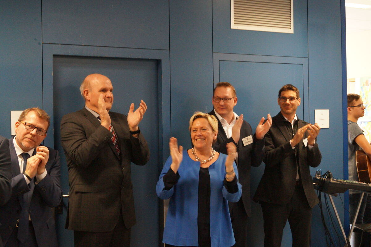 Beifall für die Schulhymne: Kultusministerin Susanne Eisenmann, Bürgermeister Mike Münzing, Landtagsabgeordneter Karl-Wilhelm Röhm, Schulleiter Andreas Bosch und Konrektor Matthias Etzel hat’s gefallen. FOTO: WURSTER