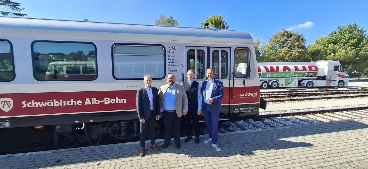Die Schwäbische Alb-Bahn fährt mit HVO-Diesel, der Tanklastwagen bringt Nachschub. Das geben die SAB-Geschäftsführer Jens Fehrenbach und Jens Hojdar, Hartwin Bisinger von der Fritz Wahr Energie und Philipp Franke, Leiter der Abteilung Mobilitätszentrale im Landesverkehrsministerium (von links), bekannt.