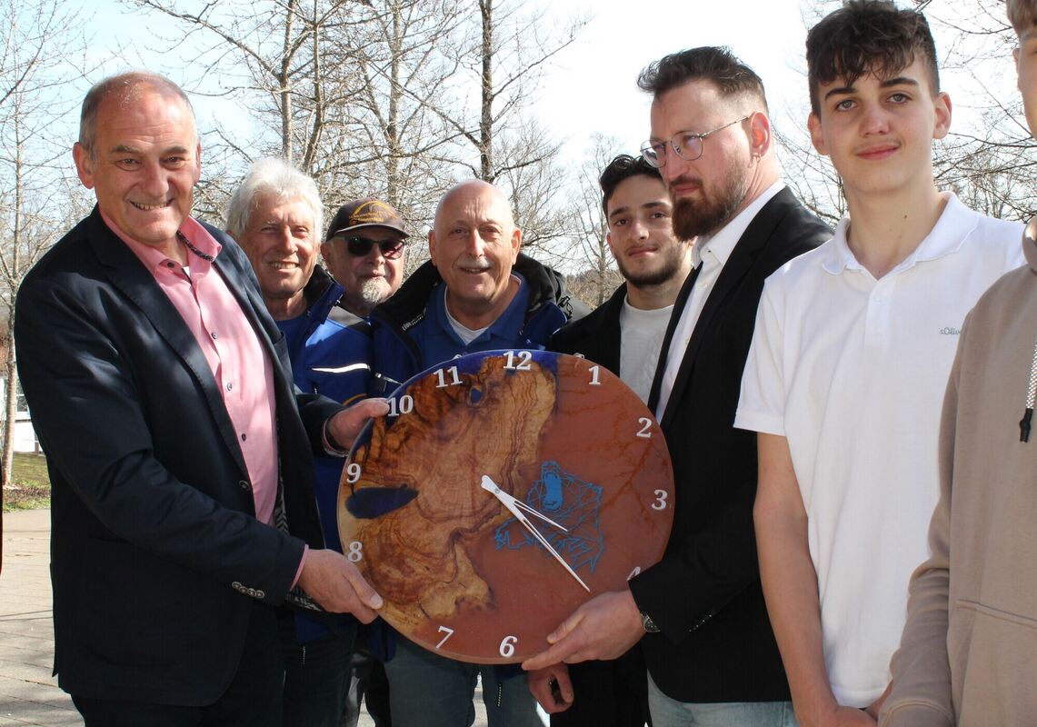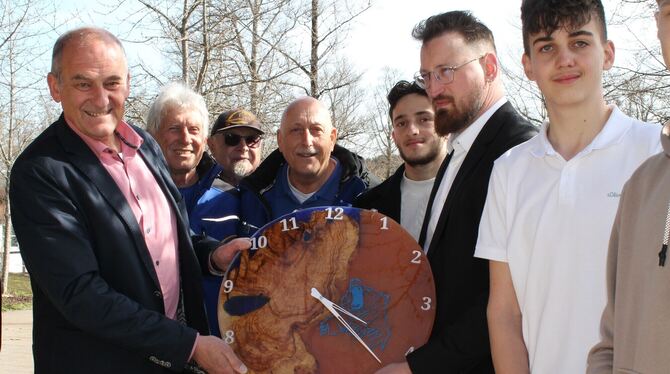 SONNENBÜHL. Die Gemeinde und das Team der Bärenhöhle haben ein ganz besonderes Geschenk erhalten: eine Uhr, die den Zeitpunkt der jeweils nächsten Führung durch die unterirdische Welt anzeigt. Klingt zunächst mal praktisch. Ist es auch, jedoch hat es mit dieser Uhr eine besondere Bewandtnis: Sie wurde erdacht, konzipiert und angefertigt von Schülern der Klasse 9 der Genkinger Brühlschule. Im Rahmen einer Projektwoche im Fach Technik haben die fünf Schüler Assad, Lasse, Phill, Tobias und Vlad den etwas anderen Zeitmesser entworfen und angefertigt.