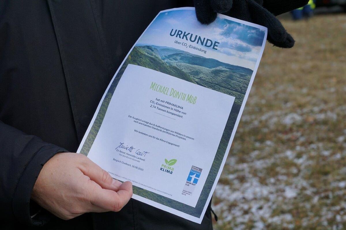 Donth hatte, um Kritikern gleich den Wind aus den Segeln zu nehmen, im Vorfeld angekündigt, dass der Transport »klimaneutral« verlaufe. Deshalb hielt er auch den Fernsehteams und Fotografen eine Urkunde der gemeinnützigen Organisation Primaklima vor die Linsen, auf der steht, dass »der Ausgleich erfolgt durch Aufforstung von Wäldern in unseren nach anerkannten Standards zertifizierten Projekten«. Dadurch seien die CO2-Emissionen in Höhe von 2,74 Tonnen kompensiert worden, bescheinigte die Vorstandsvorsitzende Henriette Lachenit. Den entsprechenden Obolus hat der Politiker aus eigener Tasche bezahlt. (GEA)
