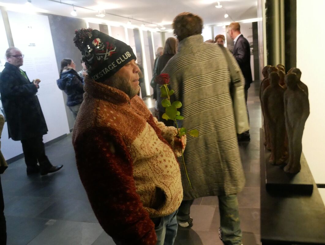 Ein Bewohner und Mitglied der »Grafenschrecks« betrachtete am Samstagabend nach der Feier im Schloss die Skulpturen im Dokumentationszentrum der Gedenkstätte.