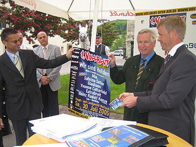 Sie gehören zu den Stars des Vollblut-Open-Airs am 30. Auch Gast beim Vollblut-Open-Air? Ein Gratis-Ticket hat Landwirtschaftsminister Peter Hauk (links) schon mal. Am Dienstag warb der Minister unter anderem mit (von rechts) Claus Dörner, Dr. Helmut Gebhardt und Karl-Wilhelm Röhm für das Konzert. GEA-FOTO: BRÄU