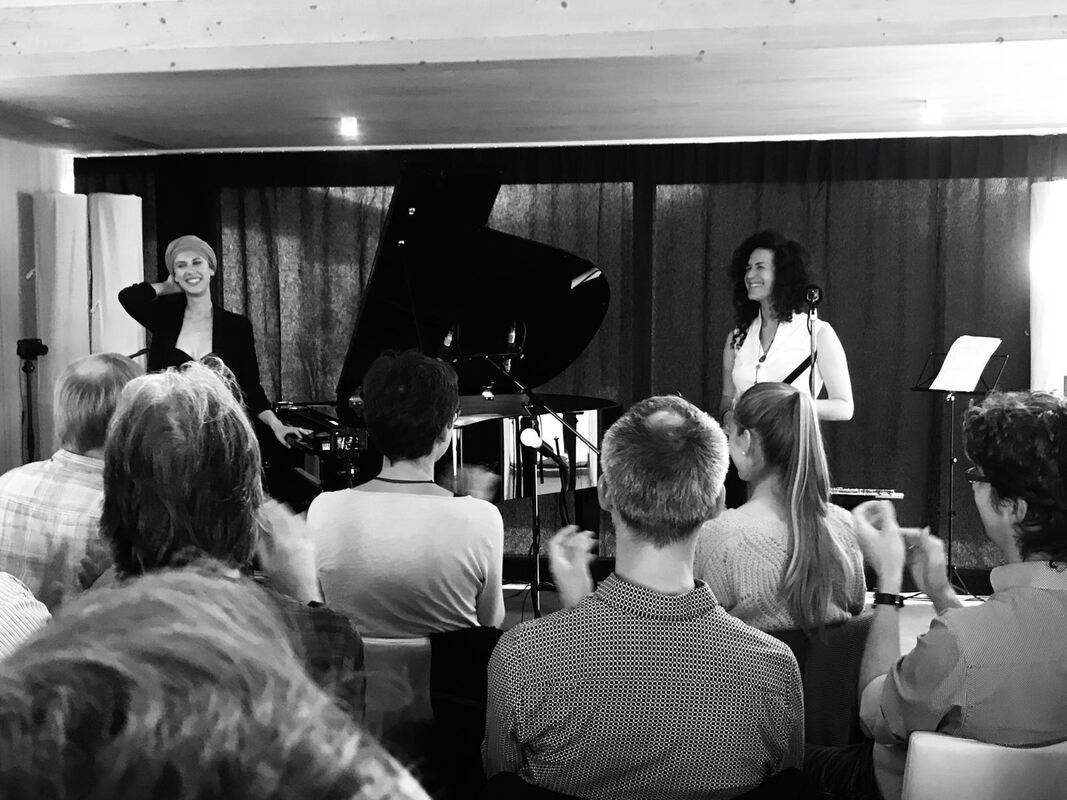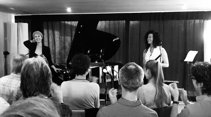 Groove, Kaffee und Kuchen: Olivia Trummer (links, Klavier ) und Hadar Noiberg (Querflöte) beim Wohnzimmer-Konzert.