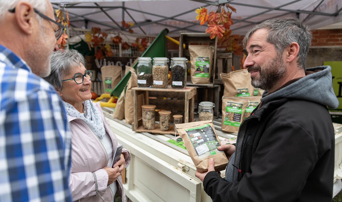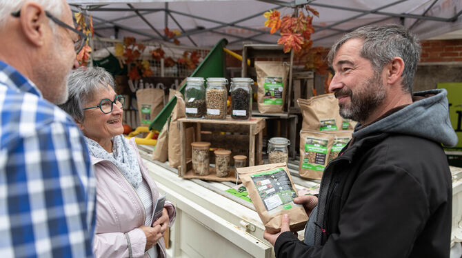 Alexander Bosch erklärt Messebesuchern, was es mit den Düngepellets aus Schafwolle auf sich hat. FOTO: SCHANZ