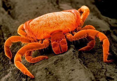 Ixodes ricinus, der Gemeine Holzbock, unter dem Raster-Elektronen-Mikroskop. Deutlich zu erkennen sind die Saugwerkzeuge des achtbeinigen Tieres.