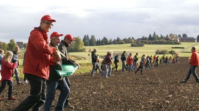 Mit gutem Beispiel ging die Lokalprominenz, von links: Erster Landesbeamte Hans-Jürgen Stede, Kreisbauernvorsitzender Gebhardt Aierstock und Bürgermeister Uwe Morgensten voran und säte genfreien Dinkel in ein Sonnenbühler Feld.