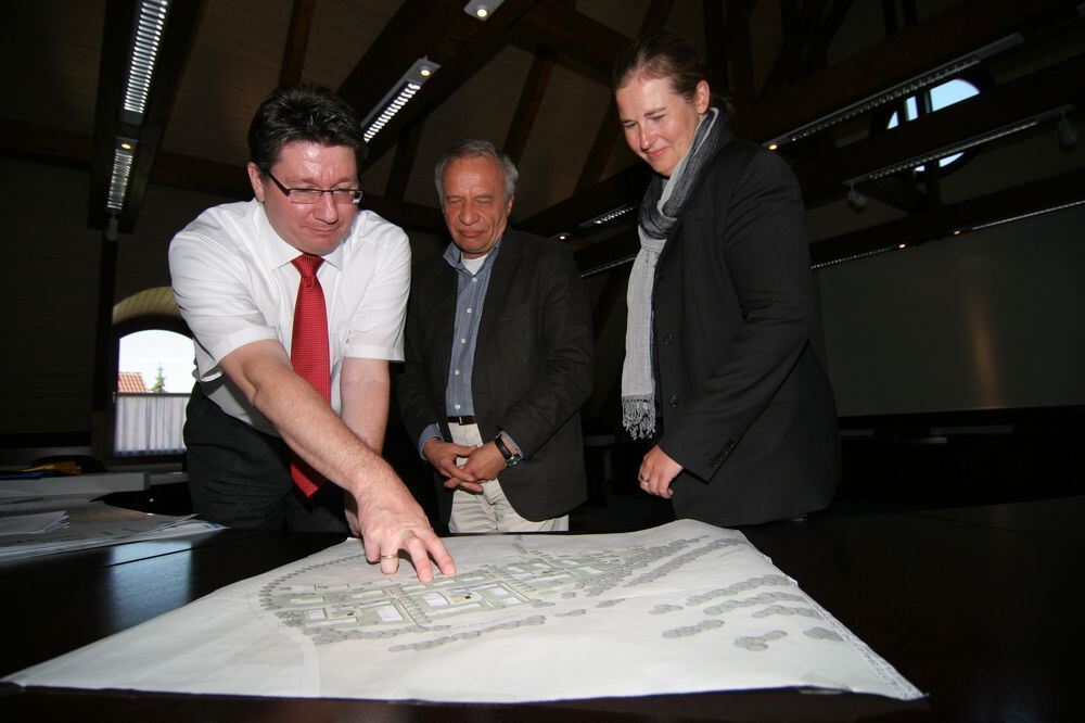 Eine kleine Gemeinde geht neue Wege, die bisher nur größere beschritten haben. Hülbens Bürgermeister Siegmund Ganser (links) betrachtet zusammen mit Stadtplaner Wolfgang Kuhn und der Tübinger Architektin Anette Hähnig (Büro Hähnig & Gemmeke, Tübingen) den Entwurf des Wohnprojekts »Schlehenäcker«.