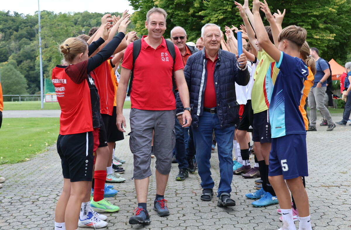 Dieter Winkler, erster Bürgermeister der Gesamtgemeinde, ging mit einem Staffelstab als Symbol als erster Läufer voran. Den besonderen Rahmen dafür gestalteten Jugendliche des Jugend-Fußballcamps: Sie standen den Teilnehmern Spalier. »Wir laufen die einzelnen Rathäuser an, wo wir Wissenswertes zu den einzelnen Orten erfahren«, informierte Schweikardt die Gruppe. Wer die Route verfolgen wollte, der wurde über einen QR-Code fündig.