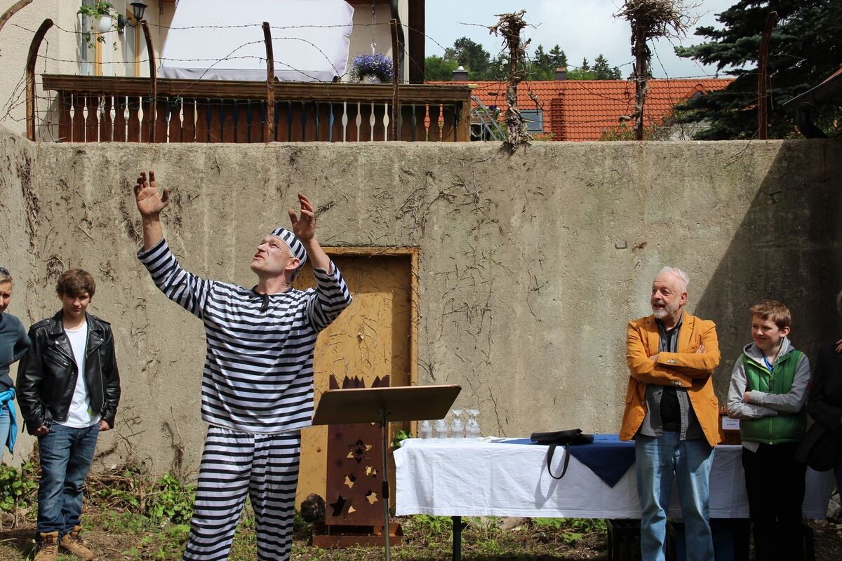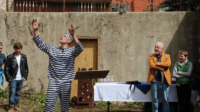 Im gestreiften Sträflingsdress: Carsten Speidel im Innenhof des Münsinger Gefängnisses, durch das seine Frau Nina Speidel von dieser Saison an auch Gästegruppen führt. FOTO: PRIVAT