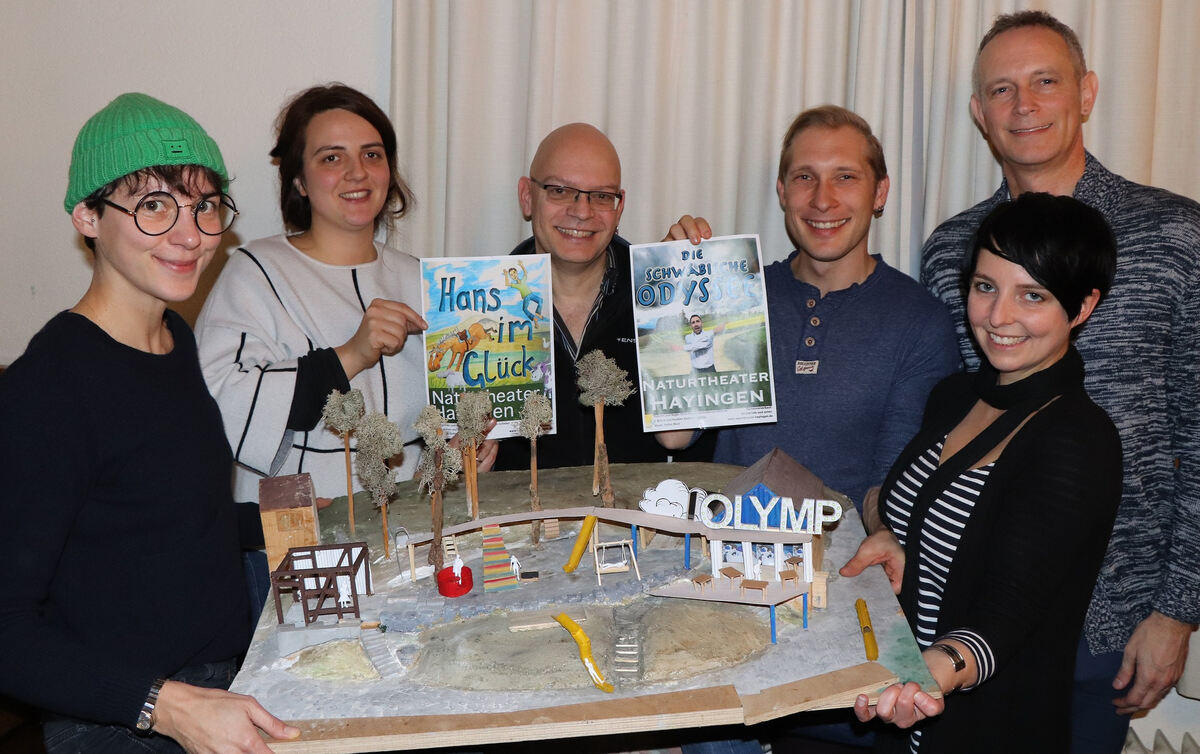 Das Team des Naturtheaters Hayingen stellt die neuen Stücke vor (von links): Bühnenbildnerin Katharina Müller, Eva Schleker, Musiker Stephan Wurz, Regisseure Jo Schleker und Silvie Marks sowie Peter Edelburg. FOTO: BLOCHING