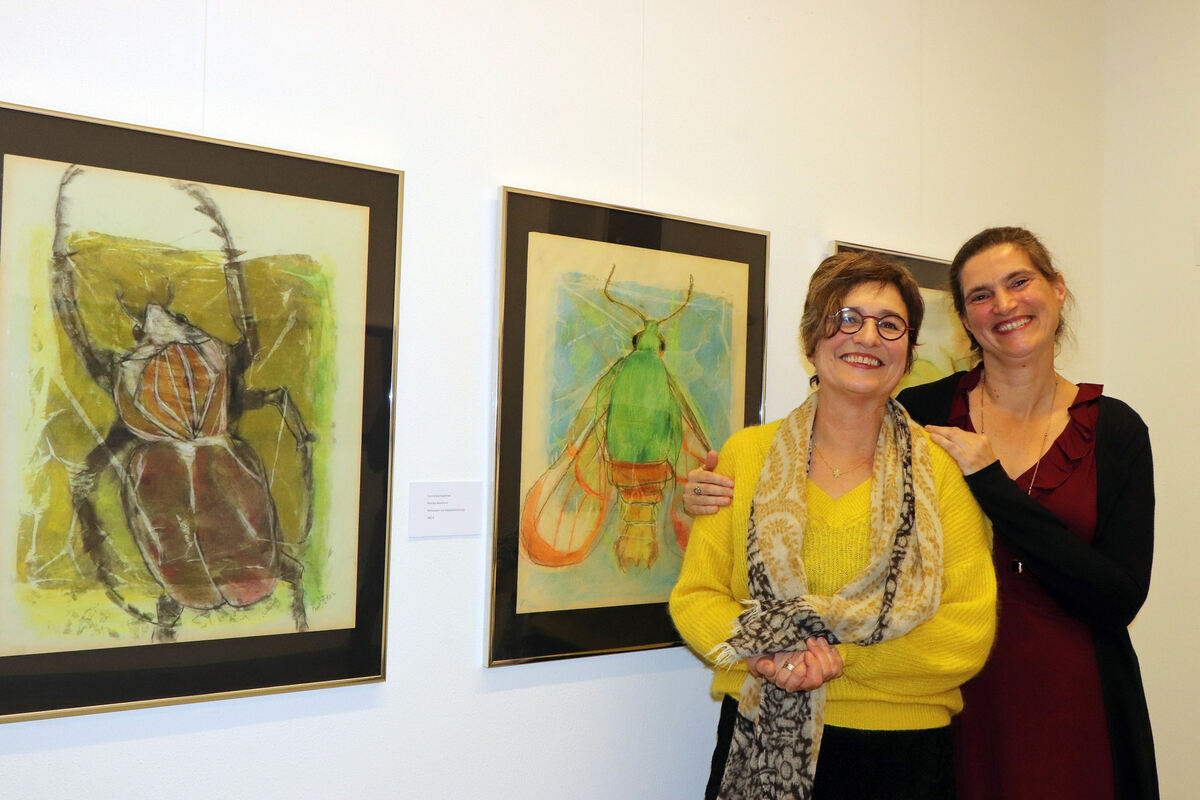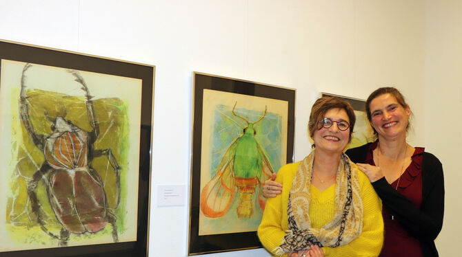 Marlies Bockhorn (links) und Eva Neidhard stellen im Biosphärenzentrum Münsingen Bilder unter dem Motto »Reichtum und Schönheit in Pflanzen und Tieren begegnen« aus. Foto: Bloching
