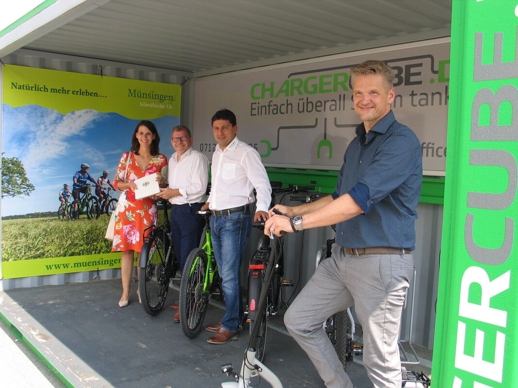 MÜNSINGEN. Staatssekretärin Rita Schwarzelühr-Sutter vom Bundesministerium für Umwelt, Naturschutz, Bau und Reaktorsicherheit hat heute der Stadt Münsingen den Förderbescheid des Bundeswettbewerbs »Klimaschutz im Radverkehr« überbracht, der mit Fördergeldern in Höhe von 2,1 Millionen Euro verbunden für ein Projekt ist, das mit zunächst rund drei Millionen Euro veranschlagt wird. Damit können jetzt insgesamt bis zu 55 solarbetriebene, mobile Ladestationen – sogenannte Chargercubes – für E-Bikes, Pedelecs und Autos mit Elektromotor finanziert und an markanten Punkten in der Landschaft zwischen der Ostalb und dem Schwarzwald sowie von Stuttgart bis zum Bodensee aufgestellt werden.