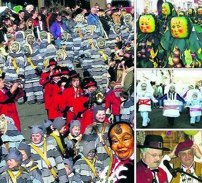 Dichtes Gedränge herrschte gestern beim Gammertinger Narrenumzug mit mehr als 5 000 Masken und Hästrägern, wie den Dunninger Holzäfel (rechts oben)und den Bussakindla aus Unlingen (rechts mitte). Zunftmeister Dr. Done (im Bild rechts unten, rechts) wurde von Peter Neudert, Präsident des Rings freier oberschwäbischer Narrenzünfte, mit der neu kreierten Hubert-Missel-Medaille geehrt.
