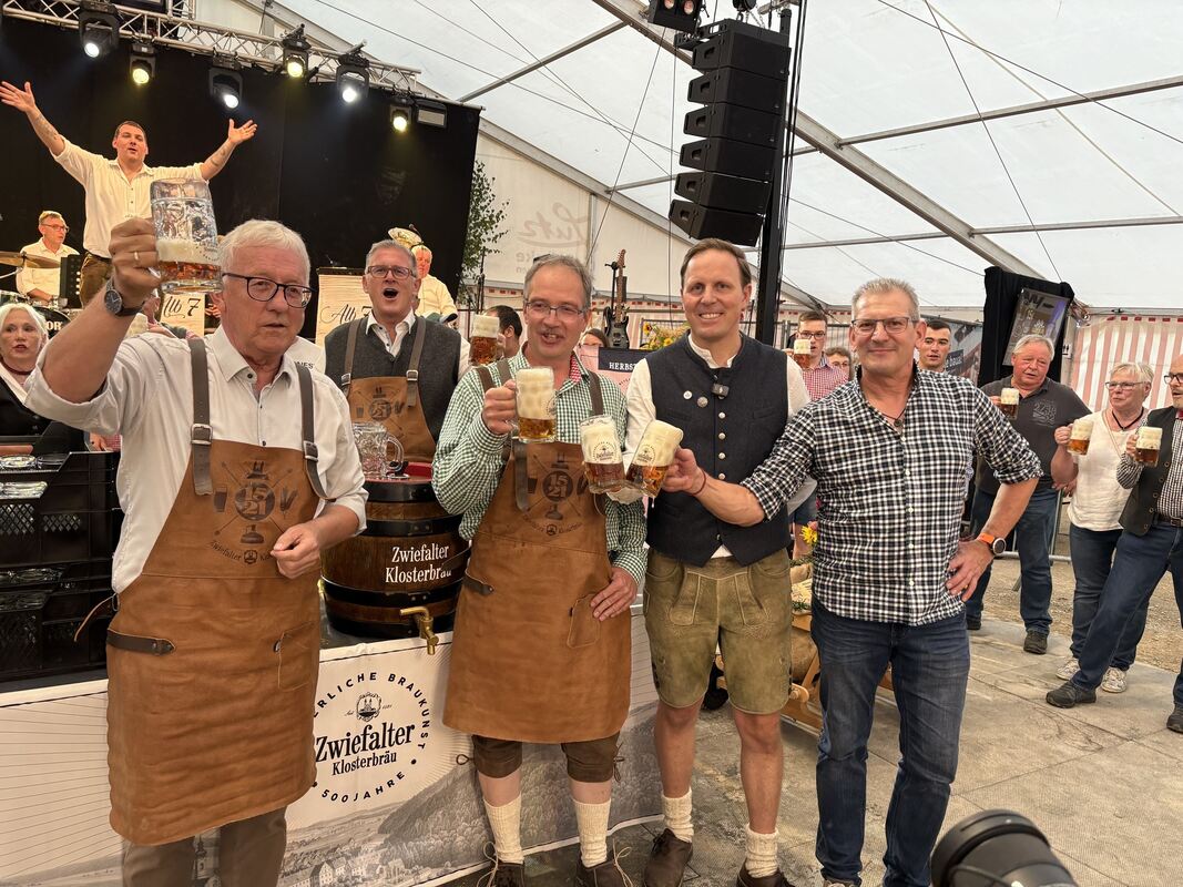 Eröffneten das Schlachtfest Dapfen mit einem Fassanstich: Bürgermeister Klemens Betz, Bundestagsabgeordneter Michael Donth, Landwirt Armin Weber, Brauereichef Peter Baader und Braumeister Stephan Aschenbrenner. (von links).