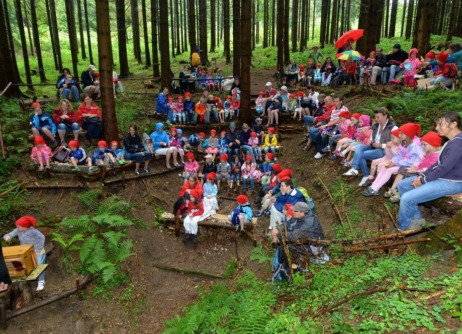 Schneewittchen-Premiere mit Hofkapellmeister (links) vor vollem Waldtheater in Wichtelhausen.