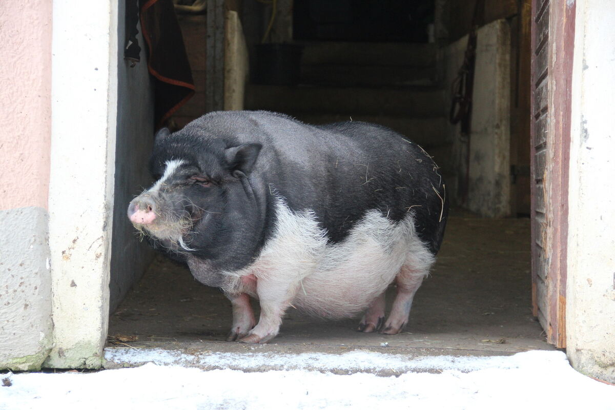 Schnee! Da bleibt Berta doch lieber im Stall. Das Zwergschwein liebt gutes Wetter – und Streicheleinheiten.