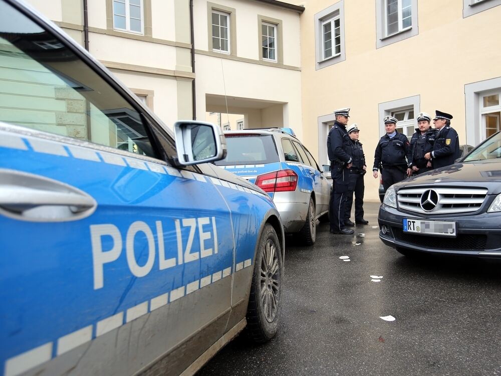 Polizeifahrzeuge vor der Psychiatrie in Zwiefalten.