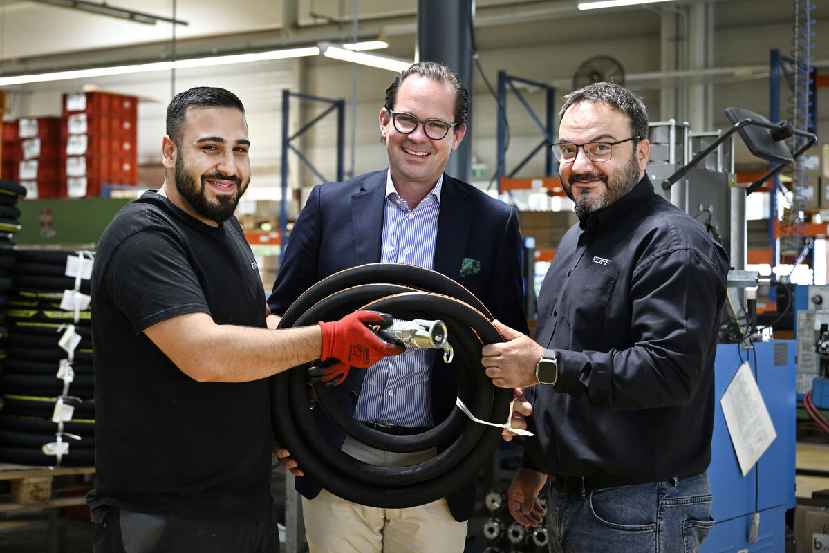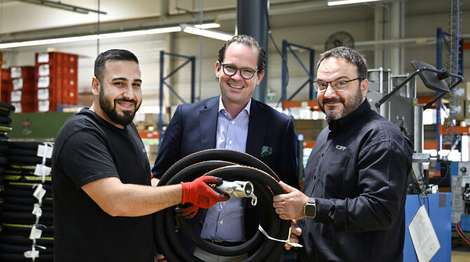 Fertigung von Mörtelschläuchen bei Reiff in Reutlingen (von links): Mitarbeiter Umut Balik, geschäftsführender Gesellschafter Alec Reiff und Ioannis Kikidis, Leiter der Fertigung.