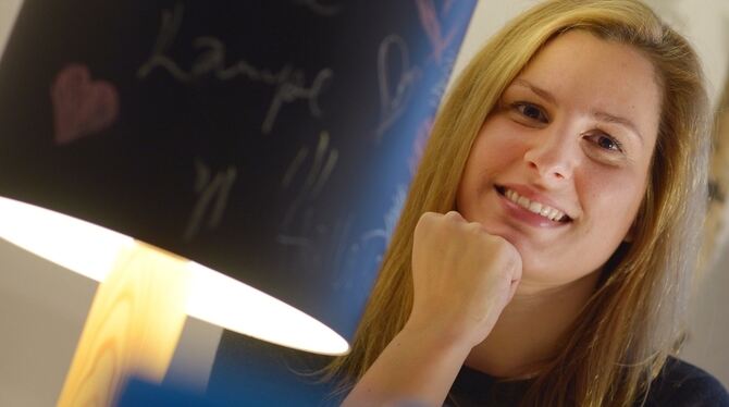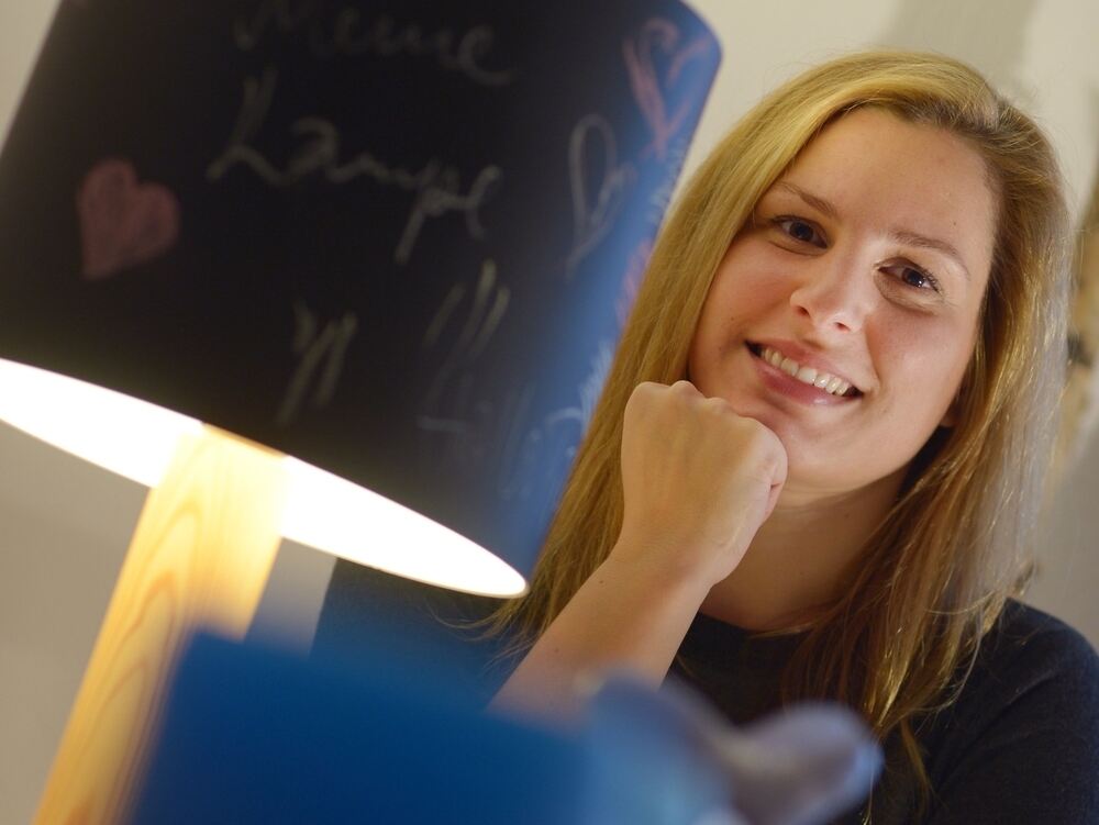 Die Designerin Kristina Markovic blickt neben der von ihr entworfenen Tafellampe »Doodle« in die Kamera. Foto: dpa