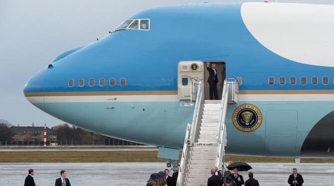 US-Präsident Obama beim Besuch in Berlin und einer der jetzigen 747-Jets, die seit den frühen 1990er Jahren den Präsidenten um die Welt fliegen. Foto: Rainer Jensen