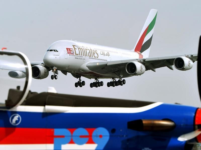 Ein Airbus A380 der Fluggesellschaft Emirates landet auf der Luftfahrtschau ILA 2010 im brandenburgischen Schönefeld.