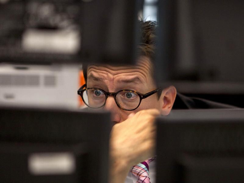 Ein Händler schaut in der Börse in Frankfurt am Main voller Sorge auf seine Monitore.