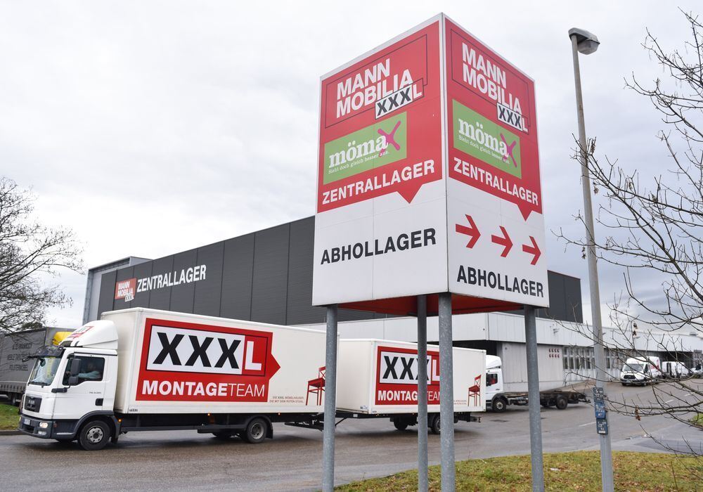 Ein Lastwagen verlässt in Mannheim das Zentrallager des Möbelhauses »Mann Mobilia«. Mitarbeiter eines Möbelhauses von Mann Mobilia haben vor dem Mannheimer Lager gegen ihre plötzliche Freistellung protestiert.