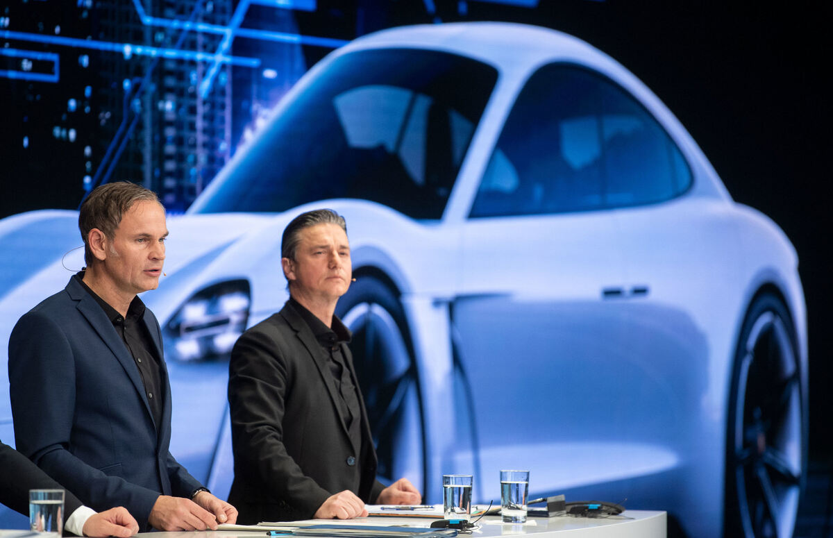 Vorstandschef Oliver Blume (links) und Finanzvorstand Lutz Meschke präsentieren die Jahreszahlen der Porsche AG. In der Projektion zu sehen, die Studie Mission E.