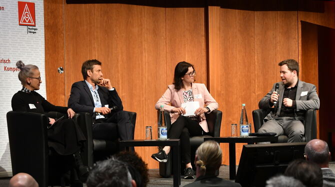 Tanja Silvana Nitschke, Jan Vetter, Anja Krätschmer und Oliver Kerl (von links) bei einer Diskussion in der Stadthalle Reutlingen über Herausforderungen und Chancen in der Automobilbranche der Zukunft. FOTO: MEYER