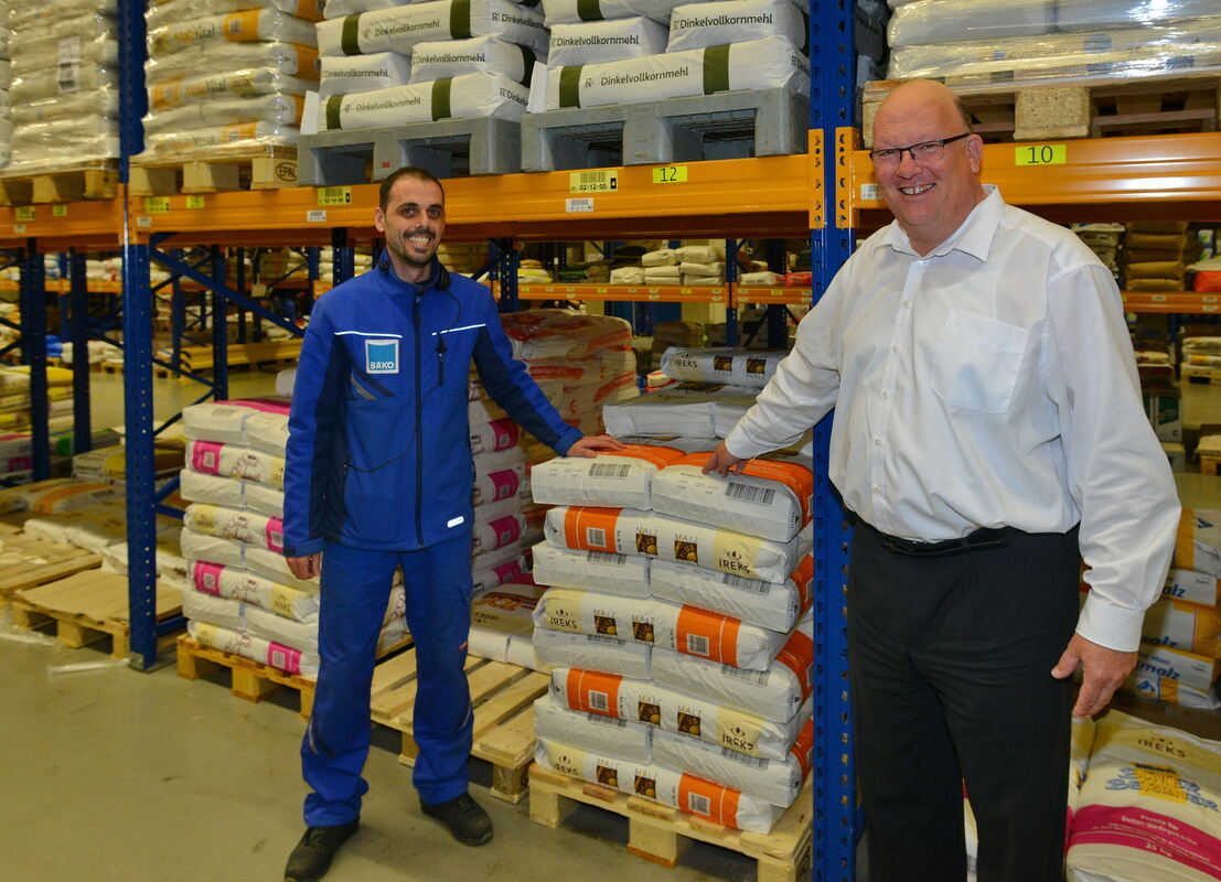 Joost Nicolai Bremer (rechts), Vorstandssprecher der Bäko Südwürttemberg, und Franz Gjini, Mitarbeiter im Reutlinger (Mehl-)Lager. FOTO: NIETHAMMER