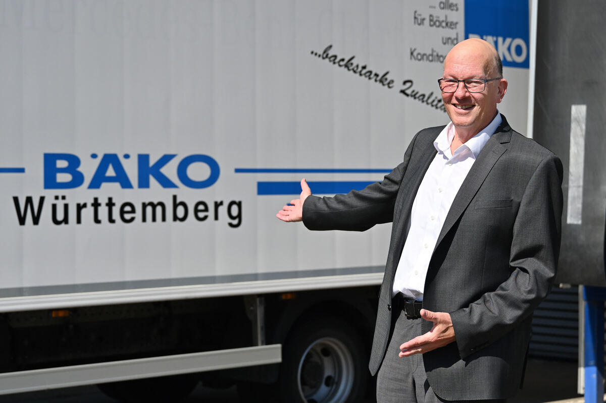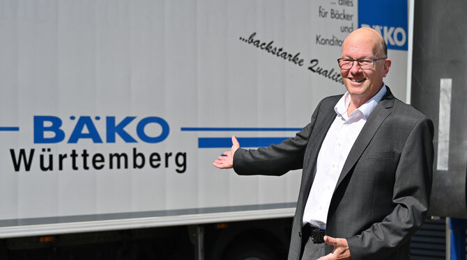 Joost Nicolai Bremer, Vorstandssprecher der Bäko Südwürttemberg in Reutlingen, zeigt auf einen Lastwagen mit der Aufschrift der künftigen Firmierung Bäko Württemberg. FOTO: PIETH