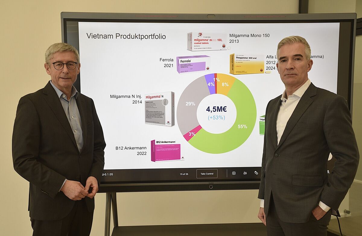 Die Geschäftsführer der Wörwag Pharma GmbH & Co. KG, Gerhard Mayer (links) und Jochen Schlindwein, vor der Schautafel des Vietnam-Geschäfts. In Ostasien war der Böblinger Hersteller und Vertrieb von Arznei- und Nahrungsergänzungsmitteln im vergangenen Jahr besonders erfolgreich. FOTO: REICHERT