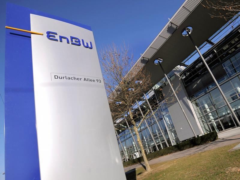 Das Logo des Energie-Konzerns EnBW vor der Firmenzentrale in Karlsruhe.