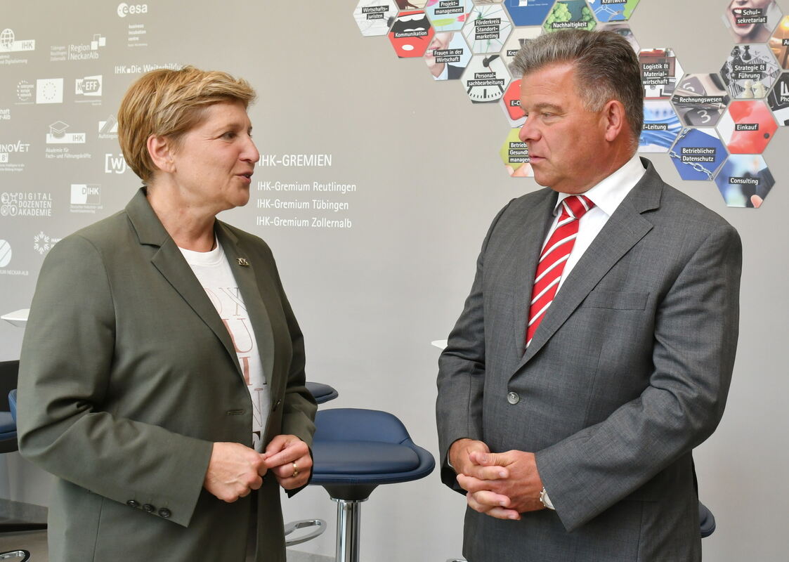 Nicole Razavi (CDU), baden-württembergische Ministerin für Landesentwicklung und Wohnen, im Gespräch mit Christian Erbe, Präsident der Industrie- und Handelskammer Reutlingen.