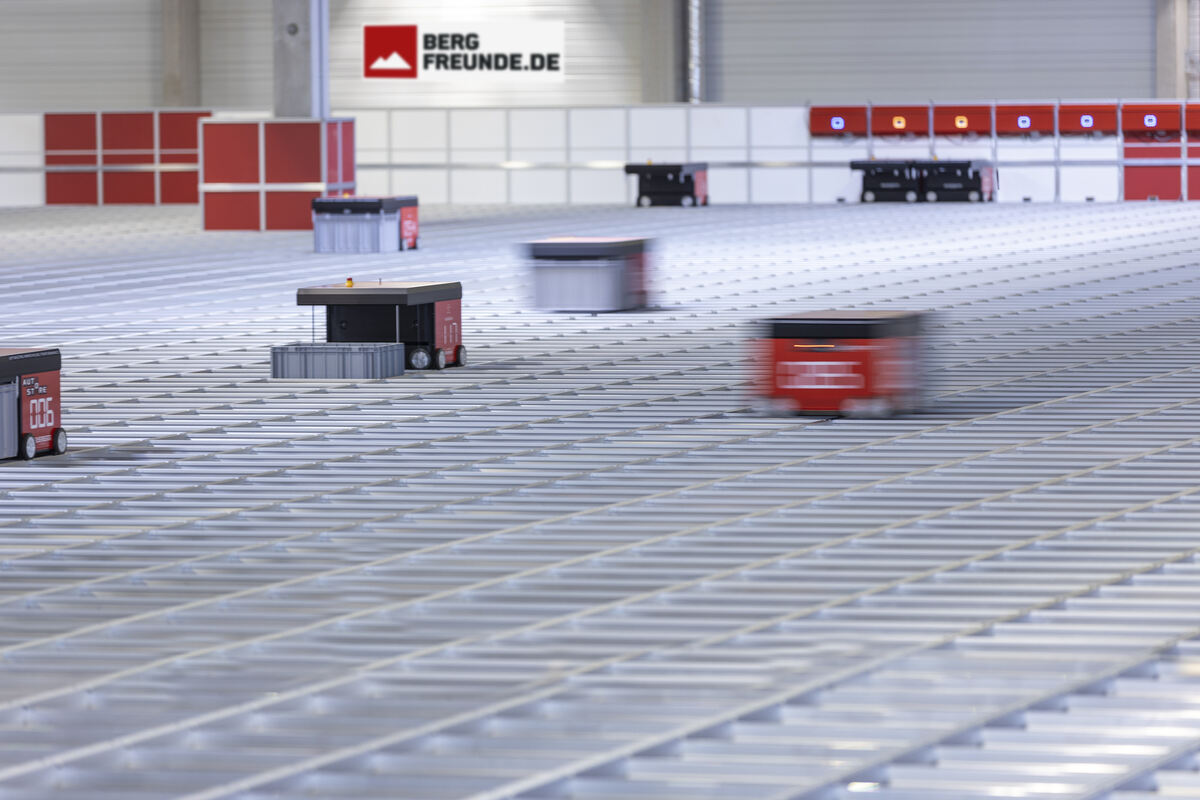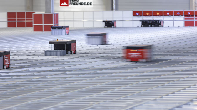 Roboter im Logistikzentrum der Bergfreunde GmbH in Rottenburg-Ergenzingen bei der Arbeit.