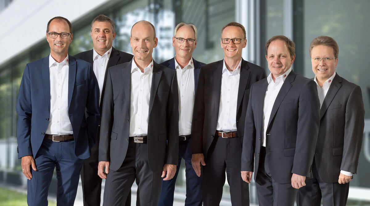 Sie führen die Berghof-Gruppe: Finanzchef Heinz-Uwe Vogel, (1.v.l.), Oliver Walter, Geschäftsführer von Berghof Fluoroplastic Technology (2.v.l.) und Eric Wildeboer (4.v.l.), Geschäftsführer Berghof Membrane Technology, leiten die Holding. Weitere Geschäftsführer sind Bernd Kapp, Thomas Horvath, Marc Finger und Frank Reißmann (v.l.n.r.). FOTO: BERGHOF