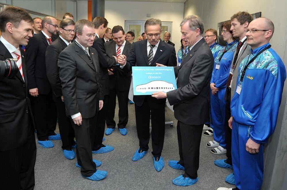 Bundespräsident Horst Köhler mit Chip-Anschauungsmaterial neben Bosch-Chef Franz Fehrenbach. Ganz links Christoph Kübel, Vorsitzender des Bereichs Automobilelektronik. Vierter von links Aufsichtsratschef Hermann Scholl. Zweiter von rechts Betriebsratschef Daniel Müller. Links neben Fehrenbach Ministerpräsident Stefan Mappus.