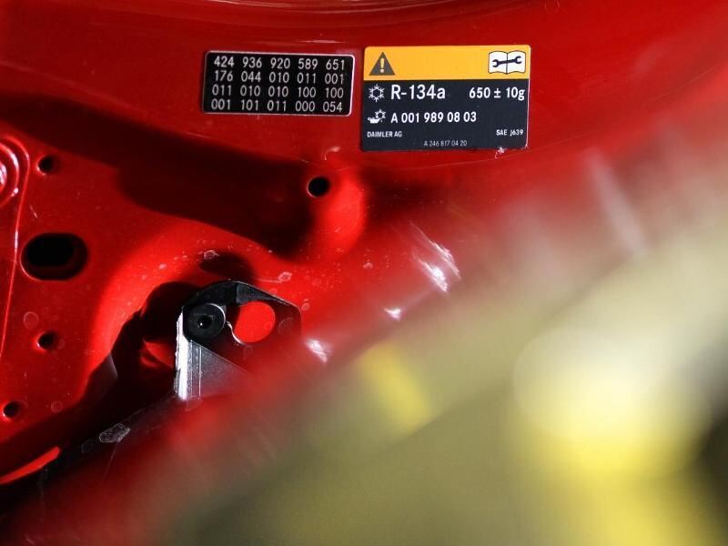 Ein Kältemittel-Hinweisschild zum Kältemittel R134a an der Motorhaube eines Wagen der A-Klasse. Foto: Felix Kästle