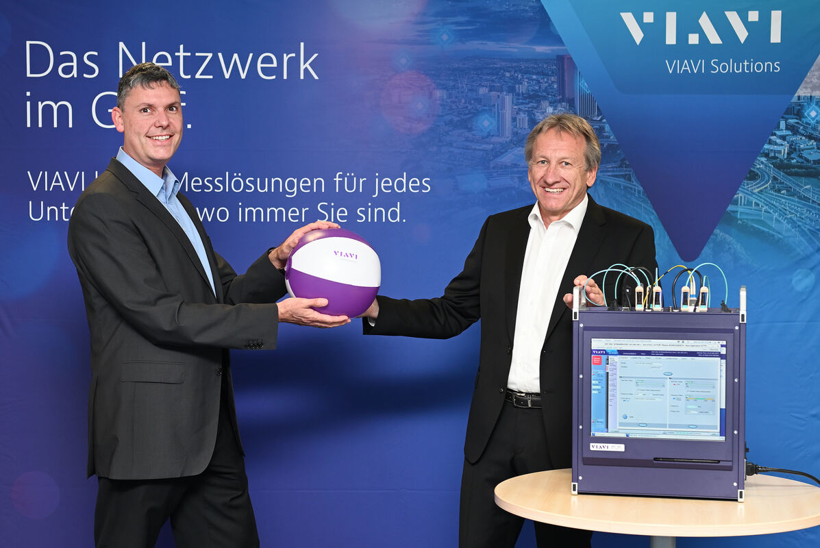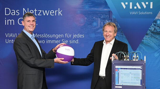 Rolf Trieflinger (rechts) gibt den Ball und damit die Geschäftsführung von Viavi Solutions Deutschland (frühere Firmierung: Wandel & Goltermann) mit Sitz in Eningen an Andreas-Christoph Beyertt.