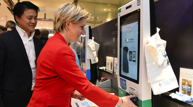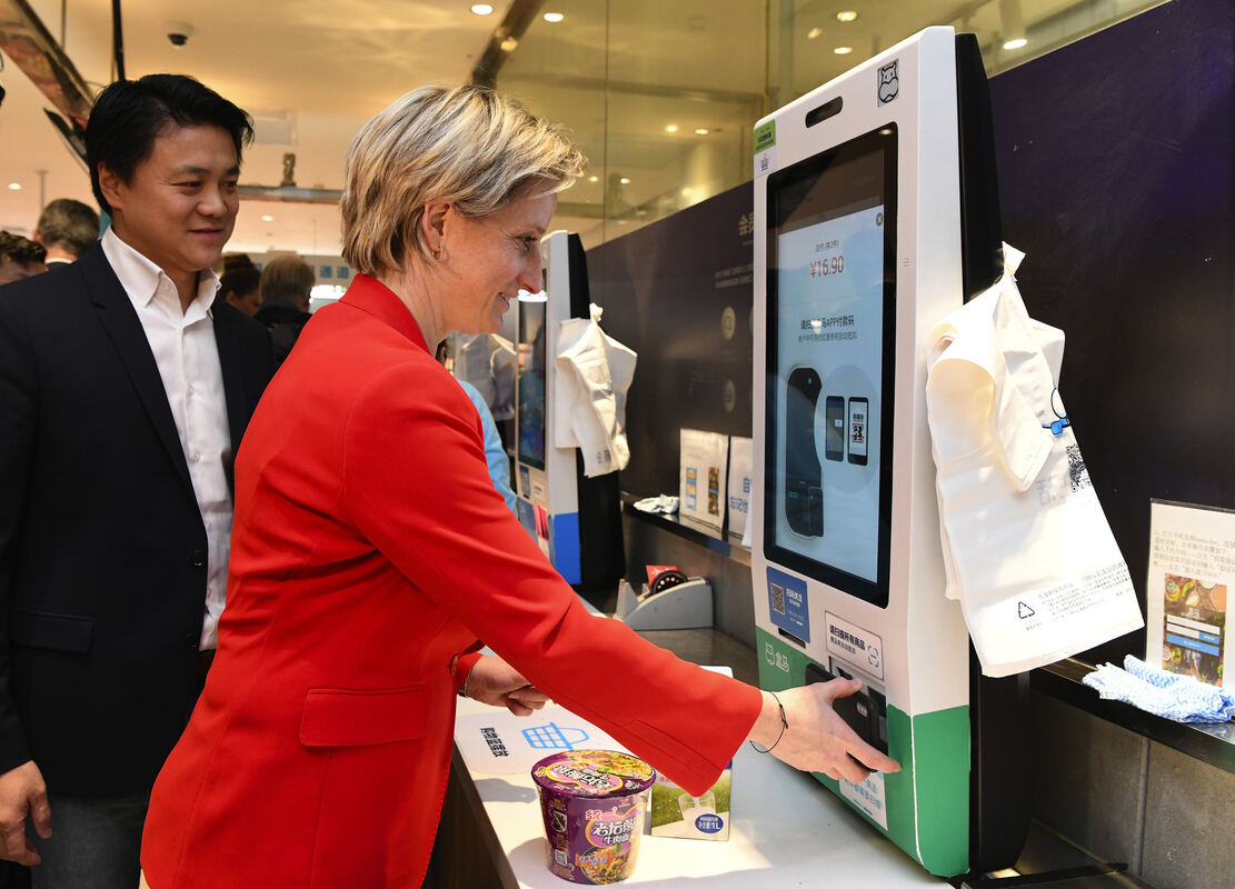 Professor Han Zheng von der Tongji Universität Shanghai erklärt Wirtschaftsministerin Nicole Hoffmeister-Kraut das Bezahlen mit dem Smartphone in einem Supermarkt. FOTO: SASCHA BAUMANN