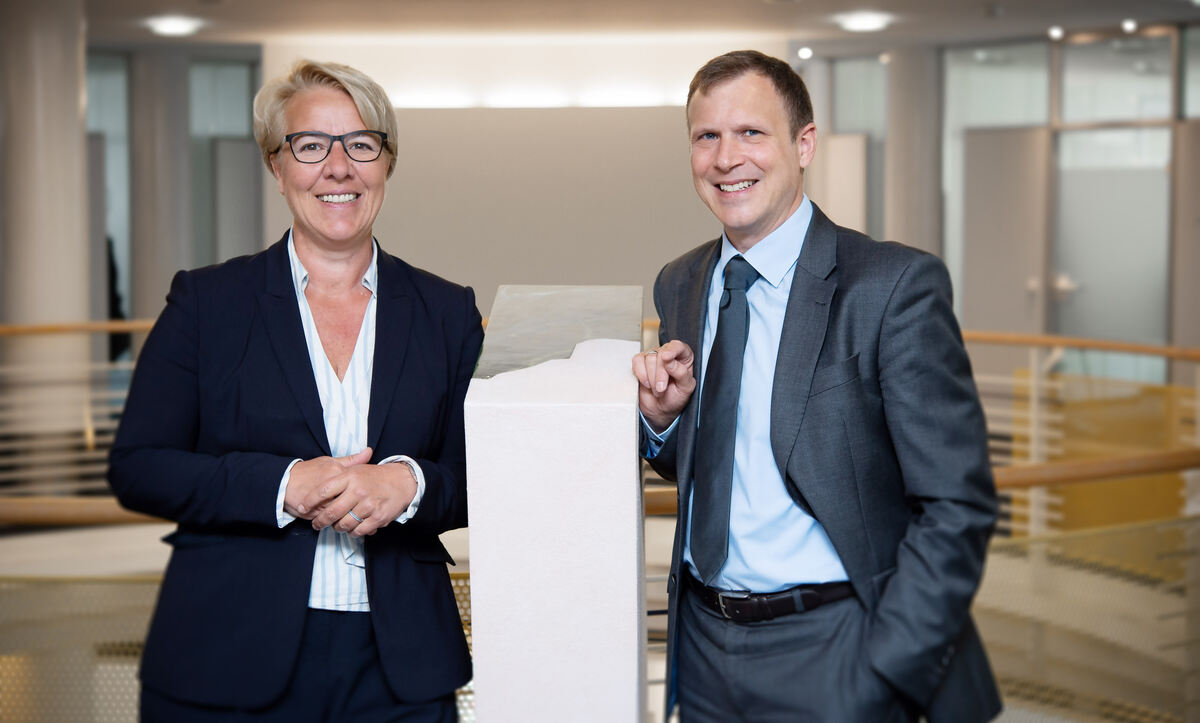 Cora Heide (zuständig für Privat- und Unternehmerkunden) und Patrick Greuter (Firmenkunden) leiten die Commerzbank-Niederlassung Reutlingen. FOTO: TRINKHAUS