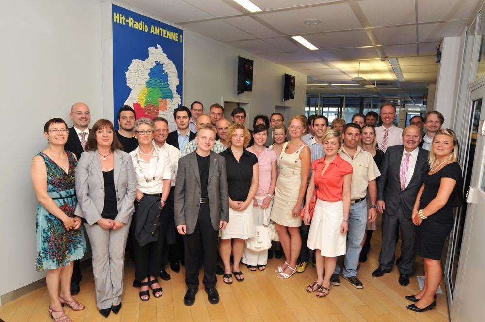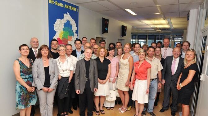 Die Wirtschaftsjunioren aus dem Bezirk Reutlingen-Tübingen-Zollernalb zu Besuch bei Hit-Radio Antenne 1. Zweiter von rechts Valdo Lehari junior, GEA-Verleger und Vorsitzender des Verwaltungsrates der Antenne Radio GmbH Co. KG.