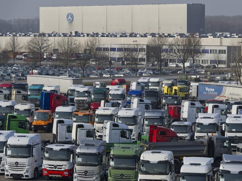 Neu produzierte Lastkraftwagen stehen in Wörth im Werk von Mercedes Benz. Der Dax-Konzern will in seiner Lkw-Sparte 2100 Stellen streichen. Foto: Uwe Anspach