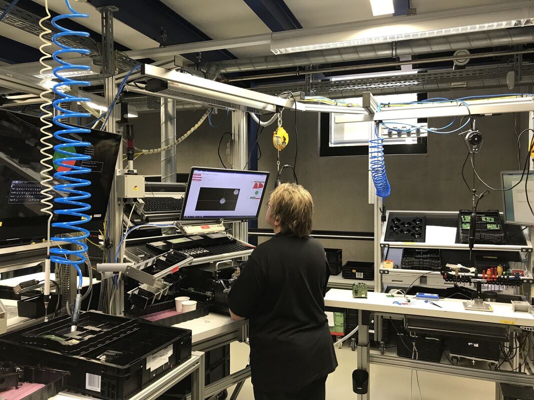 Eine Mitarbeiterin von Leuze electronic in Owen justiert ein Optikteil und gleicht einen Laser gegen eine Kamera ab. FOTOS: LEUZE