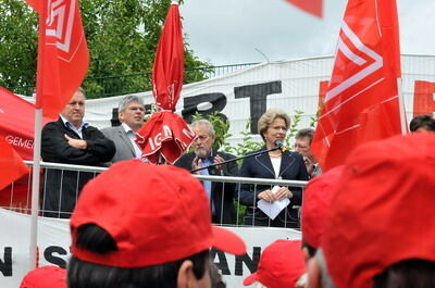 REUTLINGEN-MITTELSTADT. Mehrere Hundert Beschäftigte des Gabelstapler-Herstellers Still Wagner haben am Mittwochnachmittag in Reutlingen gegen eine Teilschließung ihres Werks und für den Erhalt ihrer Arbeitsplätze am Standort Mittelstadt demonstriert. Vom Werksgelände aus bewegte sich der Protestzug durchs Dorf zu einer Kundgebung in der Ortsmitte. Oberbürgermeisterin Barbara Bosch übte demonstrativ den Schulterschluss mit den Protestierenden und sprach von einem »gemeinsamen Kampf«. Die Position der Stadt sei »an der Seite der Beschäftigten von Still Wagner«, machte sie unmissverständlich klar. Von den Managern der Kion-Gruppe in Wiesbaden, zu der die Still Wagner GmbH seit einigen Jahren gehört, forderte sie Vertragstreue.