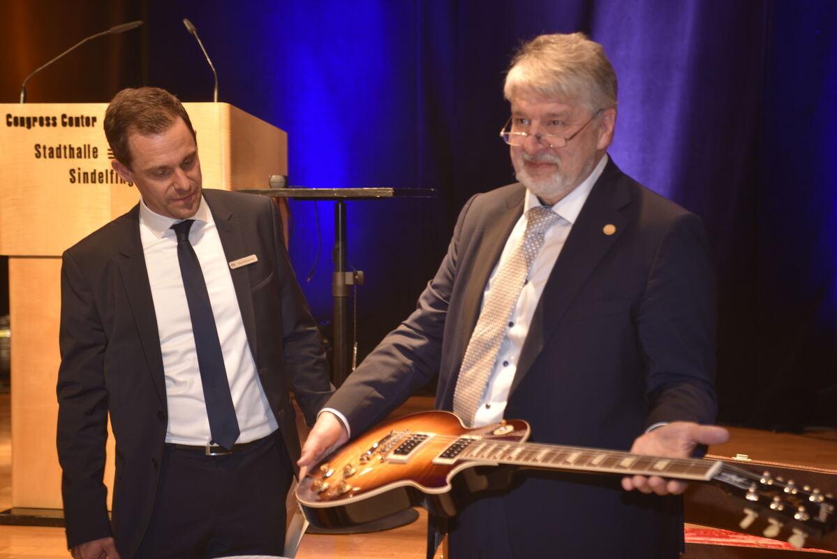 Wolfgang Klotz (rechts) und sein Nachfolger Jörg Niethammer: Zum Abschied gab's von der Bank eine neue Gitarre. FOTO: REICHERT
