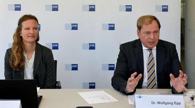 Hauptgeschäftsführer Wolfgang Epp und Konjunkturexpertin Antonia Hettinger von der Industrie- und Handelskammer Reutlingen fassten die Ergebnisse einer Umfrage unter Unternehmen in der Region zusammen.
