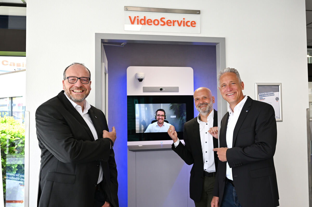 Vorstandsmitglied Martin Stadelmaier, Generalbevollmächtigter Daniel Schweizer und Vorstandsvorsitzender Martin Schnitzler führten beim Jahrespressegespräch den seit Monatsanfang angebotenen Video-Service in der Hauptstelle Metzingen der Volksbank Ermstal-Alb vor; auf dem Bildschirm Mike Ruess vom Kunden-Service-Center in Bad Urach.