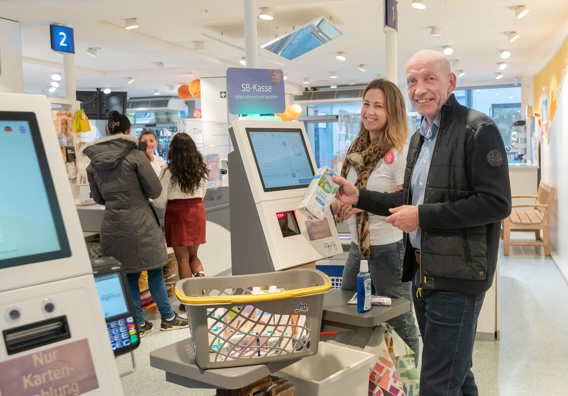 Jürgen Mayer, Gebietsverantwortlicher von dm für die Region Neckar-Alb, und Monika Rilling, Leiter der dm-Filiale in der Reutlinger Wilhelmstraße, führen vor, wie eine Selbstbedienungskasse funktioniert.